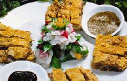3.将炒锅置火上,倒入花生油烧热,下入抹好的蛋糊的鸭肉条,炸成金黄色,鸭肉酥透时,捞出摆入盘内,撒上花椒盐即可。