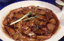③将面包切成4厘米直径圆薄片后,先涂上蛋黄糊,然后放上蛋清糊l汤匙及鸭肉1方(皮向上放)。