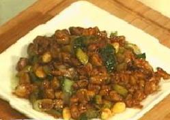 5、把酱汁倒入锅内吵出香味,放入蒜片,在倒入滑好的鸭丁,翻炒出锅即可。