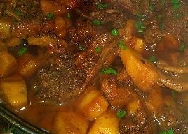 4.控干鸭肉中多余的水分,将鸭块倒入,如果鸭块不够红可以再加点酱油,鸭肉熟后放入土豆稳火闷烂(加入几滴醋会烂的更快)