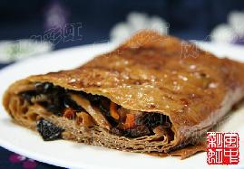 7、豆腐皮折叠,再刷一层调味汁,夹一些馅料放在上面,用豆腐皮包起来,包严,然后用几根牙签固定一下。
