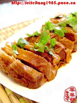 鲜腐皮12张,葱3条,美极酱油100克,八角4粒,姜3片,老抽50克,麻油100克,清水200克,生抽100克,砂糖100克,绍酒100克,鸡粉100克