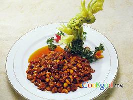 3、锅内留底油烧热,下葱、姜、蒜爆香,加入泡椒煸出红油后下花椒油、白醋、蚝油、蜂蜜、盐、鸡精、鸭腿丁略炒,加海参、腰果、银杏仁,翻炒均匀,勾芡后淋入香油,出锅即成。