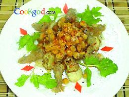 1、鸭舌洗净,放入沸水中浸泡5分钟,捞出后刮去舌苔,加蒜片腌渍12小时,再用盐腌渍30分钟后裹上20克脆浆,放入烧至五成热的色拉油中小火浸炸5分钟,捞出备用。