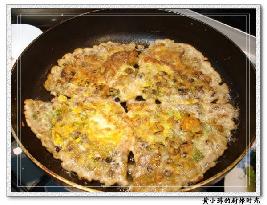 3.倒油在平锅里,待热后将拌好的材料倒入锅中,先煎个七分熟;然后在上面打上鸭蛋,量自己掌握就可以。 然后翻过来再煎另一面,撒上胡椒粉(胡椒粉可要可不要,主要根据自己的喜好)