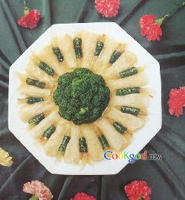 2、将竹笙煨透与柴把鱼翅相间放在碟上,呈放射形,放入蒸笼蒸5分钟取出,倒去汁。