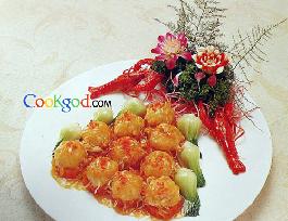3、虾丸滚烧好的鱼翅,入笼蒸熟,取出装盘,浇调好味的南瓜汁,点缀盘饰即成。