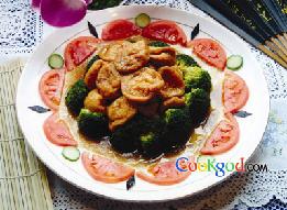 鸭嘴鱼1条(重约600克),西兰花50克,西红柿50克,黄瓜片10克。调料劲霸牌鲍鱼汁100克,鸡汤30克,鸡粉10克,白糖30克,盐32克,蚝油20克,生粉150克,鸡蛋黄250克,葱姜水450克,味精、胡椒粉各10克,色拉油1000克,湿淀粉10克,明油5克。