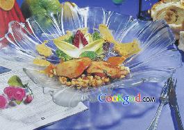 (4)鹅肝装盆,配以面包粒,淋上芥末汁和白兰地汁。