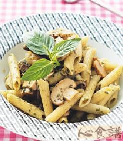 2.热锅,倒入橄榄油,放入香菇片、蘑菇片炒香,再加入青酱以小火煮约30秒,续放入作法1煮熟的斜管面拌匀即可(盛盘后可依喜好另加入九层塔装饰)。