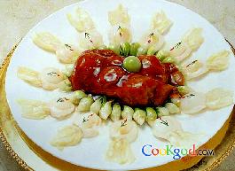 头去鳃和牙板骨,洗净,对准鱼口从鱼顶骨处砍开(不要砍断)。鸡足、鸭掌洗净,去掉粗皮。白菌洗净,发透(稍大的可剖成两半)。猪肥膘肉切成约3厘米长、1厘米粗的条。炒锅置旺火上,下猪油烧至约200℃,放入鱼头稍炸,并烹入料酒,至鱼头略呈黄色时捞出。滗去一部分油(锅内留油约75克),将猪肉、鸡足鸭掌同料酒、葱姜放入稍火南,加入鸡汤,烧沸去尽浮沫。烧锅底垫上蔑算,再垫上鸡足、鸭掌,然后将鱼头、猪肉及汤汁全部倒入,加酱油、红酱油、金钩、白菌等,置小火上慢烧约30分钟至熟,待汤汁约剩1/3时,去掉葱姜、猪肉、鸡足、鸭掌等,然后加入冰糖和蒸好的大蒜,烧至冰糖熔化,汤汁浓稠起锅,盛于大盘内即成。