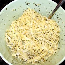 意大利面,蒜末,羊乳干酪,百里香和新鲜西红柿拌在一起就做成了这道平日的晚餐。
