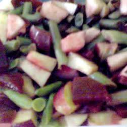 罐装切片甜菜225克,沥干切成丁,罐装切成段的四季豆1罐(400克),沥干,大苹果1个,去皮去籽切成丁,橄榄油1茶匙,苹果醋1汤匙