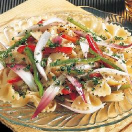 将蝴蝶意粉、红菜椒丝、绿菜椒丝和洋葱丝放入碗中,调入橄榄油、盐、黑胡椒碎、法香碎和柠檬汁,搅拌均匀即可。