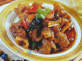 4、炒锅内放入香油,在旺火上烧到七至八成热,下入姜末炸出香味随即放入冬笋、豌豆、木耳煸炒几下,烹入芡汁,翻炒均匀后,再下入炸好的肥肠,迅速颠炒几下,裹匀芡汁后,滴上香油即成。