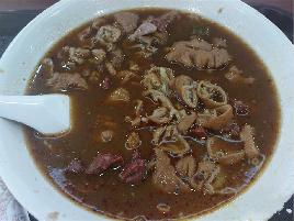 3.另取一汤锅,倒入麻辣卤汁煮滚,加入已切片的肥肠,转小火煮滚约30分钟后熄火,让肥肠浸泡30分钟至入味即捞起。