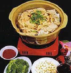 (1)草菇、香菇一分为二,鲜笋切棱形。洗净、装入砂锅内待用。