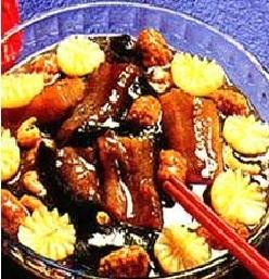 5、另在锅内烧开清汤,力口盐、味精、料酒、胡椒粉等调料,勾二流芡,取出笼内海参扣入大盘中,将勾好芡的滋汁淋于盘中,再淋上些许鸡油即成。