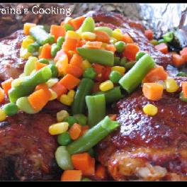 鸡大腿(thigh)4个,杂蔬(江豆角,胡萝卜,玉米粒,土豆)适量,蒜蓉辣酱20mL,蚝油20mL,醋20mL,料酒20mL,盐10mL,白胡椒粉5mL,香油10ml,蜂蜜适量