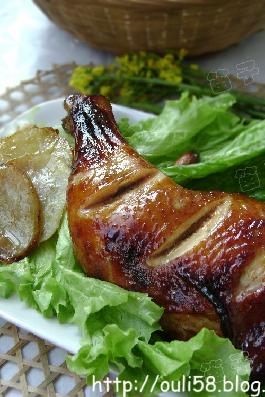 6.鸡腿表面刷一层叉烧酱(我比较喜欢这味道 )放在土豆上面.