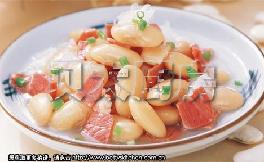 红润的火腿赋予了骨汤鲜美的属性,芸豆又被骨汤施了魔法,面相由干瘪苍白的色泽,变得嫩黄而丰满,在朵朵银花的陪衬下份外妖娆诱人。热量标注:此菜热量为514千卡/人