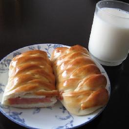 高筋粉130克,酵母2克,盐1克,糖15克,温水65克,蛋12克,牛油10克,配料:芝士片4片,火腿4片,扫面蛋液适量