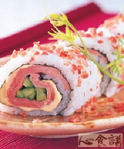 3.海苔片上舖满寿司饭,覆盖上一层保鲜膜后,将海苔片翻面朝上,并包入火腿片、起士片、作法1后捲起,再滚裹作法2即可。