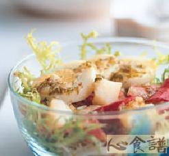 鬚苣1颗,蛋1个,培根1片,马铃薯1/4个,红甜椒丁5公克,芥末油醋汁适量