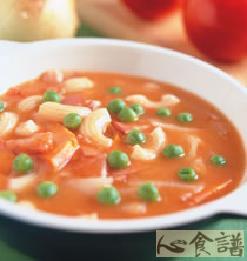 A.奶油30公克,月桂叶1片,培根小片50公克,洋葱片50公克,B.红萝卜片30公克,白萝卜片30公克,蕃茄酱1大匙,蕃茄碎1大匙,面粉14公克,C.牛高汤600㏄,豆仁30公克,熟通心面50公克,起司粉少许,盐少许,黑胡椒粉少许,糖少许