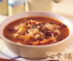 义式米形面50公克,洋葱1/2个,蕃茄2个,红萝卜1/2根,高丽菜1/6个,西洋芹2根,培根丁少许,牛高汤800㏄,巴西里末少许,红腰豆罐头1/4罐,盐少许,胡椒粉少许