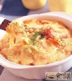 4.烤盘中放入作法1的豆腐,淋上作法2的材料,撒上起司丝,放入已预热的烤箱以220℃烤至表面上色即可。上桌前可撒上少许青海苔粉。