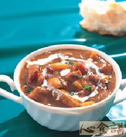 (4)将牛肉、红酒放入煮,等酒精蒸发后,再加入高汤、牛奶、月桂叶、盐、胡椒粉,以小火煮约1小时后,将鲜奶油倒入拌匀,盛入碗中,再撒上巴西里末即可。