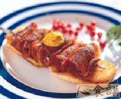 4.将作法3的牡蛎串放在烤酥的吐司上,再将黄芥茉挤在牡蛎串上即可。