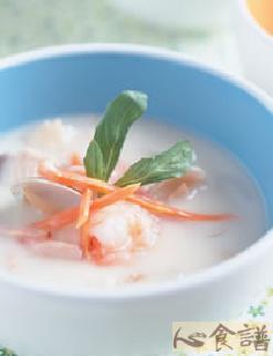 3.依序将鱼高汤、鲜奶、花枝、虾仁、蛤、鲷鱼放入作法2的锅中,以小火混匀煮开再续煮约10分钟,最后以调味料调味即可。