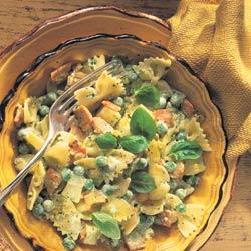 水煮马铃薯500克,加拿大腌熏猪肉(培根)300克,中等大小洋葱1颗,干蝶形面或其他形状意大利面225克,盐、黑胡椒适量,冷冻豌豆175克,橄榄油11/2汤匙,香蒜酱85克,酸奶油300毫升或原味希腊酸乳酪300克,点缀:,新鲜罗勒叶,配菜:,巴马乳酪40克