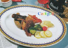 材料德国肉肠、培根、羊排、牛柳、小牛肉、节瓜、土豆、西兰花、小红萝卜、红酒、洋葱末、百里香、盐、胡椒、油