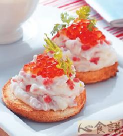 5.取一片作法2的吐司,抹上适量作法4的馅料,上方放置适量鲑鱼卵即可(重复此步骤至材料用毕)。