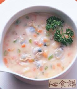 蛤蜊300公克,洋葱1/4个,红萝卜20公克,西芹30公克,马铃薯100公克,培根20公克,奶油30公克,鱼汤800㏄,鲜奶油100㏄,白酒少许,百里香少许,月桂叶1片,Worcester汁1茶匙,面煳2大匙