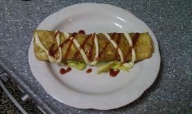 洋葱炒香后加蘑菇炒熟在加培根拌匀,3个鸡蛋加盐打匀后入锅煎,倒入炒好的料,放均匀,再撒上芝士条,等蛋熟后把它卷起来,装盆用番茄酱和色拉酱装饰。