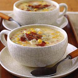 火鸡肉培根(烟肉)3片,橄榄油1汤匙,大洋葱1个,切碎,马铃薯225克,不削皮,切丁(1.5厘米见方),低钠零脂肪鸡汤2罐(每罐约410克),玉米(粟米)粒1罐(约430克),沥干,红甜椒1个,去籽后切碎,低脂(2%)牛奶480毫升,盐1/2茶匙,罐装青辣椒碎1汤匙