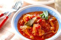5)深锅中加入香叶、适量水、蕃茄酱、红酒、鸡粉及去皮切碎后的西红柿,煮开后改小火煮20分钟(中途不断搅拌),最后用盐、胡椒调味,盛入碗中,添上荷兰豆即可。