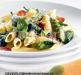 意大利通心面 300g, 芦笋 500g(去根,切段), 培根 150g(切小片), 小菠菜叶 200g, 帕玛森奶酪粉 120g, 白胡椒粉,盐 各1/3茶匙(2g)