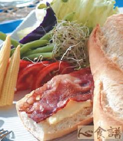 法国面包1段,起士片2片,培根片2片,玉米笋2支,蕃茄片3片,美生菜叶适量,苜蓿芽适量,四季豆适量,紫高丽菜1片