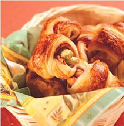 1.)将面团排入烤盘,放入烤箱内解冻,烤箱门关上,但不要启动开关,放约30~40分钟后取出。将面团展开,分别放入材料(2)(3)(4)后,再卷起来,排入烤盘中备用。将鸡蛋打散成蛋液备用。