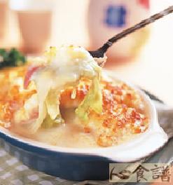 4.另取一容器,先将大白菜铺在底部,再加入作法3的材料,撒上起司丝、起司粉及红葱头末,用强微波加热2分钟即可。