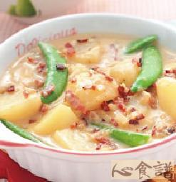 2.取一炒锅,烧热后加入奶油爆香洋葱末、培根碎,接着放入作法1的马铃薯块煎至金黄色,加水(略盖住材料的1/2高)煮煳,起锅前加入鲜奶油、盐及甜豆拌匀即可。