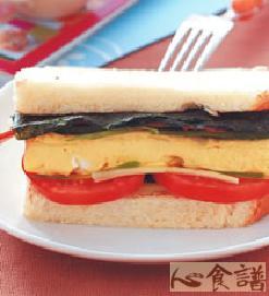 6.将土司抹上适量的美奶滋,放上作法5的厚蛋烧,再放上作法1的培根、小黄瓜条与海苔片即为厚蛋三明治。