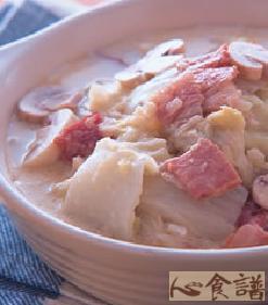 大白菜300公克,洋菇30公克,培根30公克,蒜末5公克,洋葱末5公克,奶油20公克,鲜奶油20公克,盐1/2小匙,胡椒粉少许,鸡粉少许