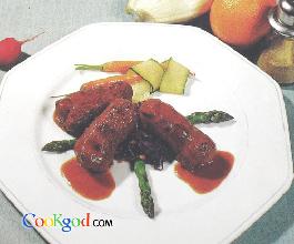 (5)装盆时,各式蔬菜垫在盆中央,将牛肉卷拔去牙签,搁在蔬菜上,淋入(4)中的汁水即可。