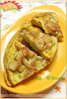 1.薯香蛋饼,准备小型土豆一个,去皮切成小丁,锅中热少许油,把土豆丁给炒熟。如果想少油的话,也可以用煮的,没什么影响。